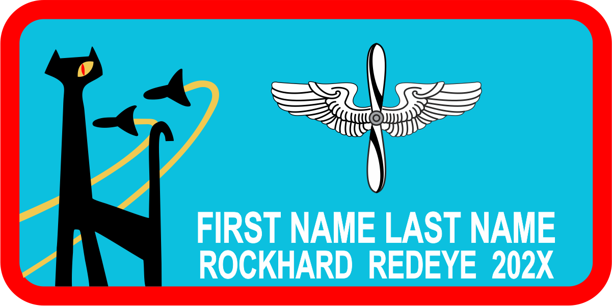 USAF Academy CS-25 Cat Logo Name Tag - Light Blue Background, Red Border, Black Cat & Aircraft, White Wings & Text - 2023 Updated Name Tag