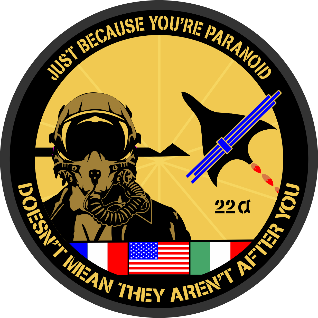 Edwards AFB TPS Class 22-A Patch - Just Because You're Paranoid Doesn't Mean They Aren't After you 22A -- France Flag - American Flag - Italian Flag 4" Patch