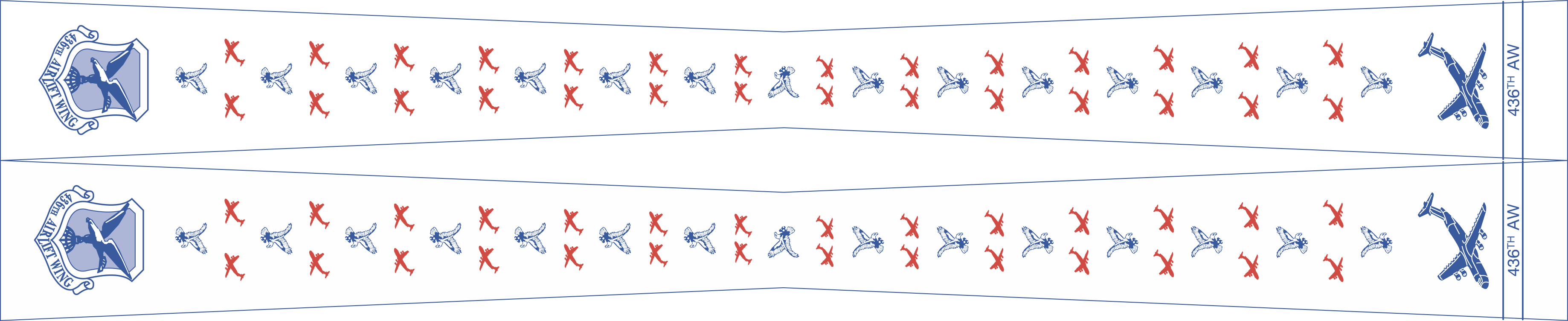 Dover AFB 436 AW- White body with red C-5 and blue eagles alternating over the body of the scarf. One end has 436 AW patches and the other end has C-5 436th AW text. Size 4" x 2" x 48"