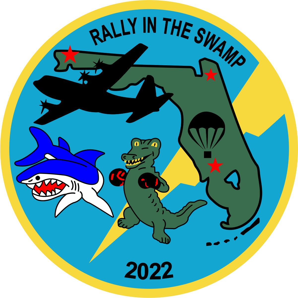 Blue Background, Green Florida State, Black C-130, Green Gator, Blue/White Shark