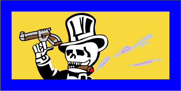 Laughlin AFB 85 FTS Yellow Background, Blue Border, Skull with Top Hat with Gun Pocket Tab 2"