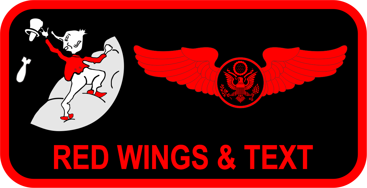 McConnell AFB 350th Air Refueling Squadron Friday Name Tag - Black Background, Red Border, Dude on a Cloud Dropping Bombs, Red Wings & Text