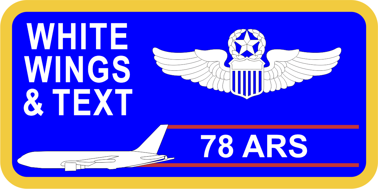 McGuire AFB 78th Air Refueling Squadron Name Tag - AF Blue Background, Yellow Border, White KC-46 with 78 ARS Text with Two Red Lines, White Wings & Text Optional Leather Backing