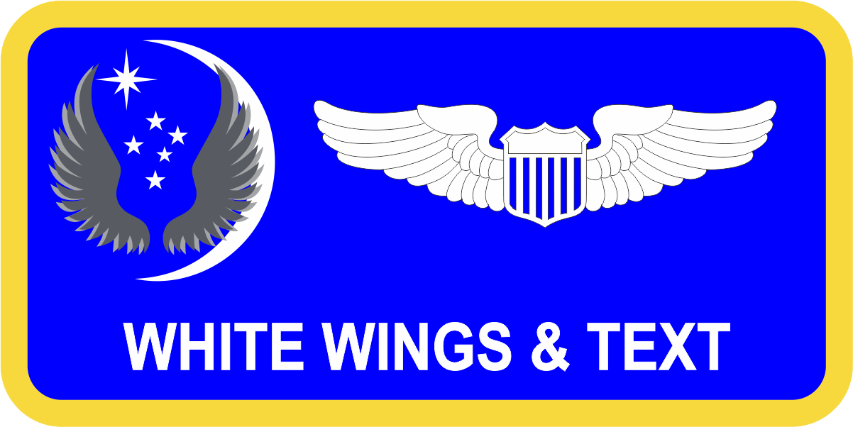 McGuire AFB 818 MSAS Blue Name Tag - AF Blue Background, Yellow Border, Gray Wings - White Stars & Moon, White Wings & Text