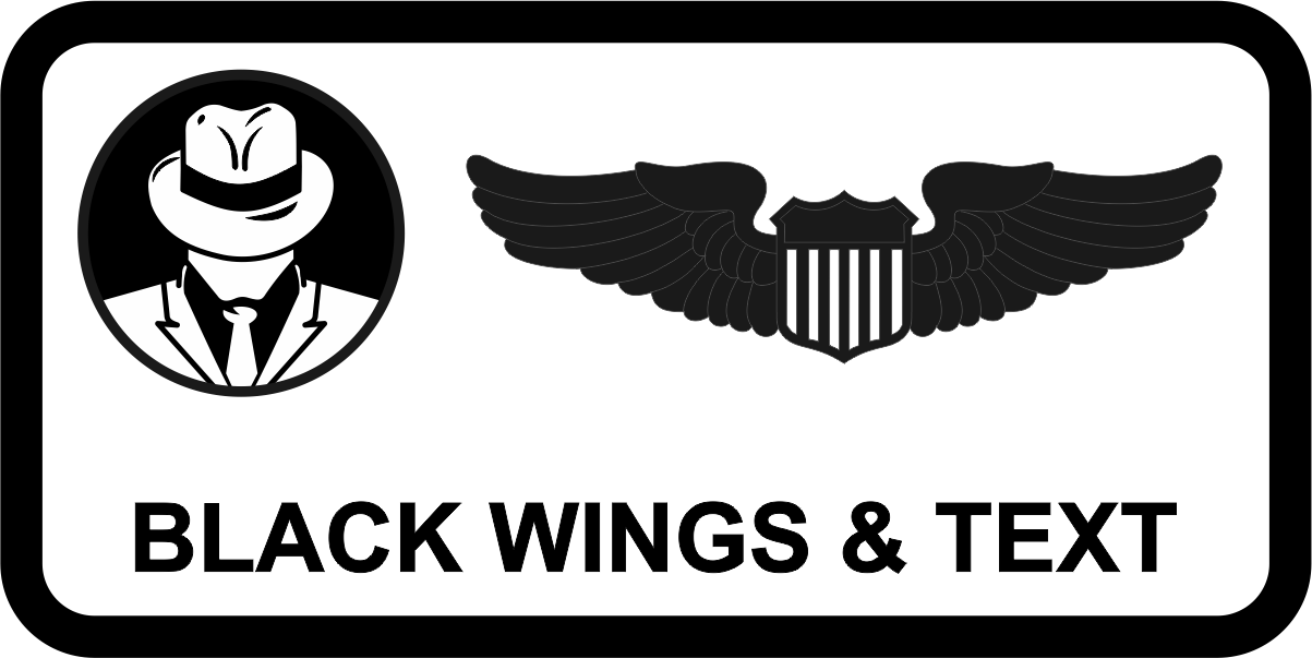 McGuire AFB 621 AMOS Man with Hat Logo Name Tag - White Background, Black Border, Man with Hat Logo in Black & White, Black Wings & Text - Leather Backing Optional