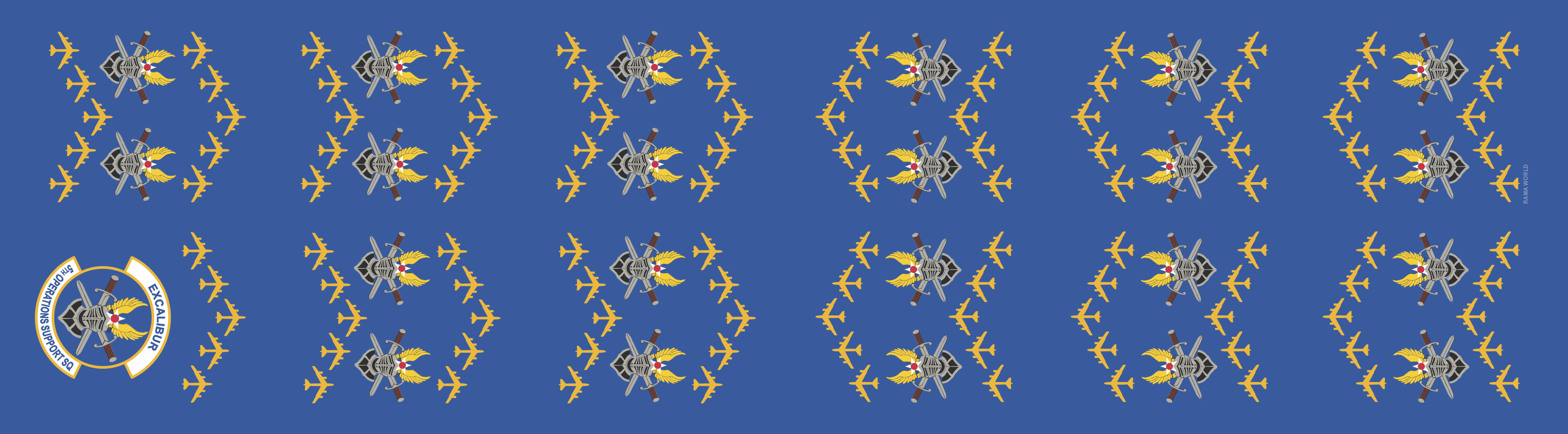 Minot AFB 5 OSS Flight Scarf - Blue body with yellow B-52 in V pattern alternating with a knighthead, swords, and Hap Arnold star with wings and a patch on one end. Size 6" x 46" Pleated / Fabric = White Speckle Jersey
