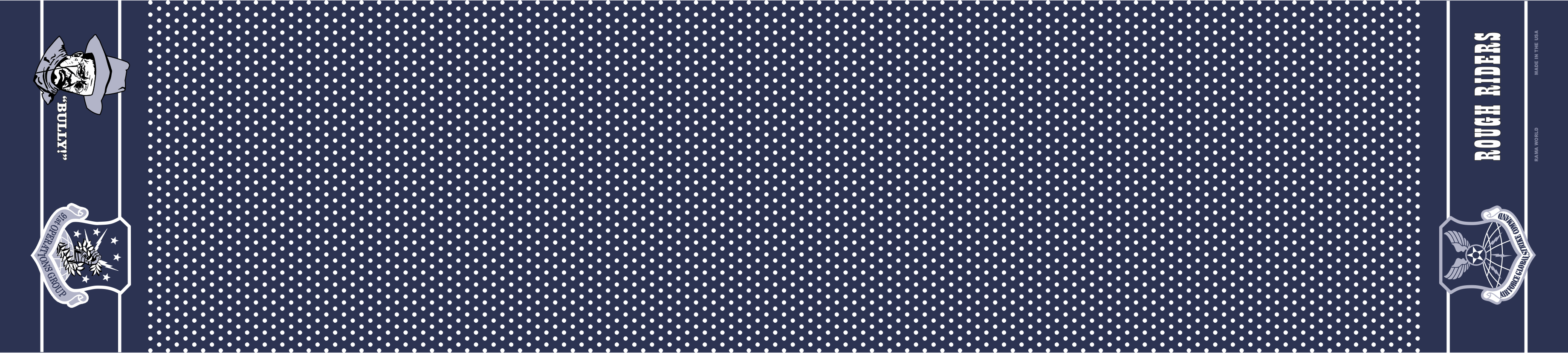 Minot AFB 91 OG Flight Scarf - Dark blue body with white polka dots over the body of the scarf, 2 patches on opposite ends, a cowboy head "Bully!" on one end and "Rough Riders" on the other end. size 5" x 48"