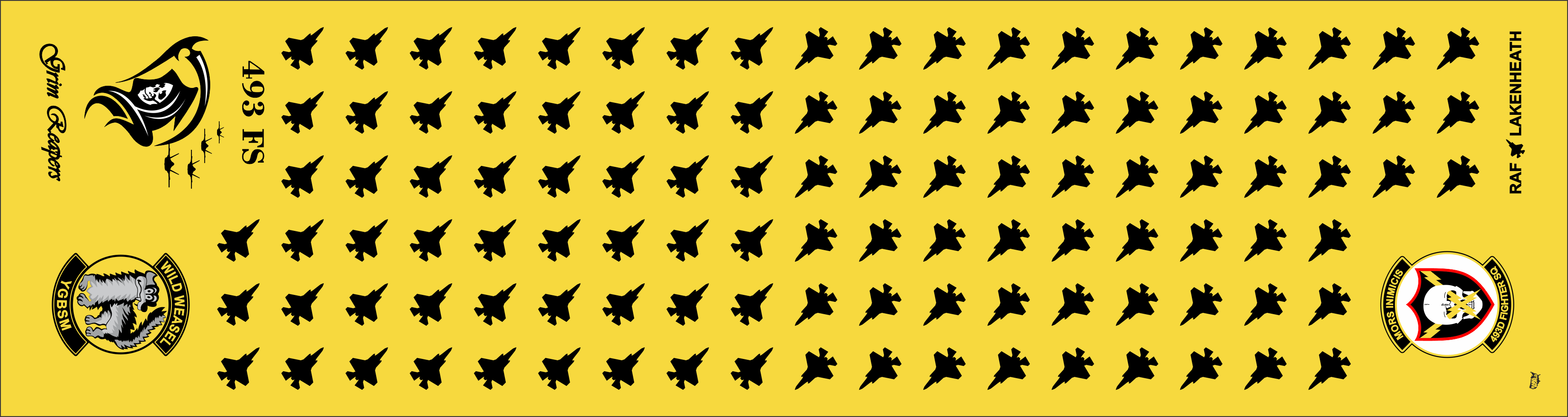 RAF Lakenheath  493 FS Flight Scarf. AF Yellow Background With F-35 Aircrafts Through Out, & SQ Emblems On The Ends Of The Scarf. Size: 6" x 48".