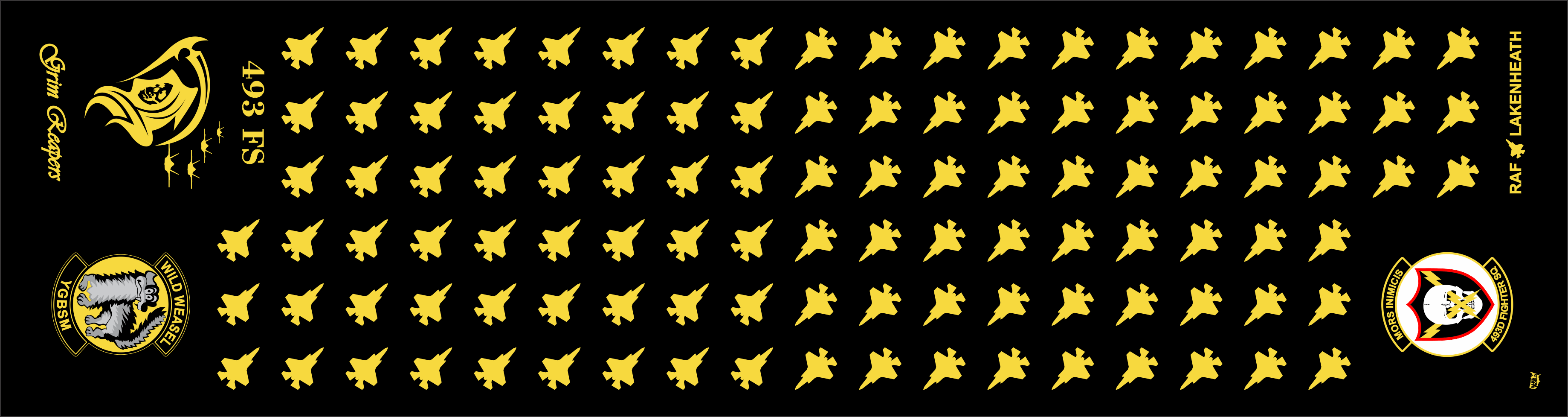RAF Lakenheath 493 FS Flight Scarf. Black Background With F-35 Aircrafts Through Out, & SQ Emblems On The Ends Of The Scarf. Size: 6" x 48".