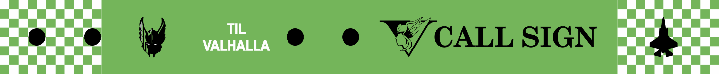 RAF Lakenheath 495 FS Bag Tag. Green Background With Checkerboard Pattern On The Sides, Valkyrie Helmet Logo & "TIL VALHALLA" In-Between Snaps, 495 FS Logo On The Left Of Call Sign & F-35 On The Far Right. Our standard size measures 13.5" x 1.5" when snapped.