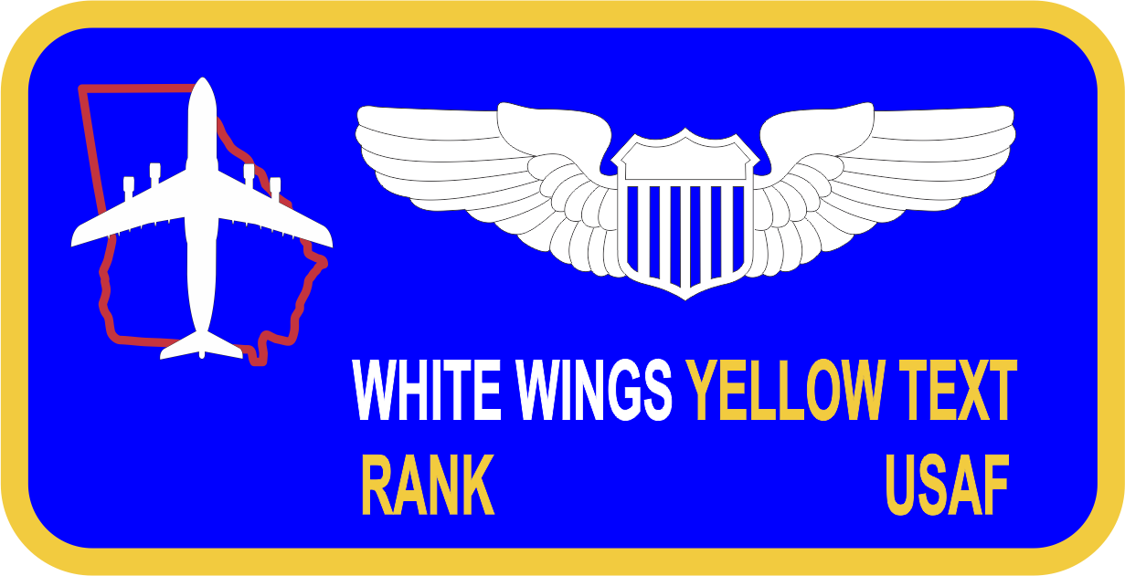 Robins AFB 339 FLTS Enlisted- Blue background with yellow border, white wings and yellow text with Georgia outline with a C-5 arcft - 2 Lines of Text