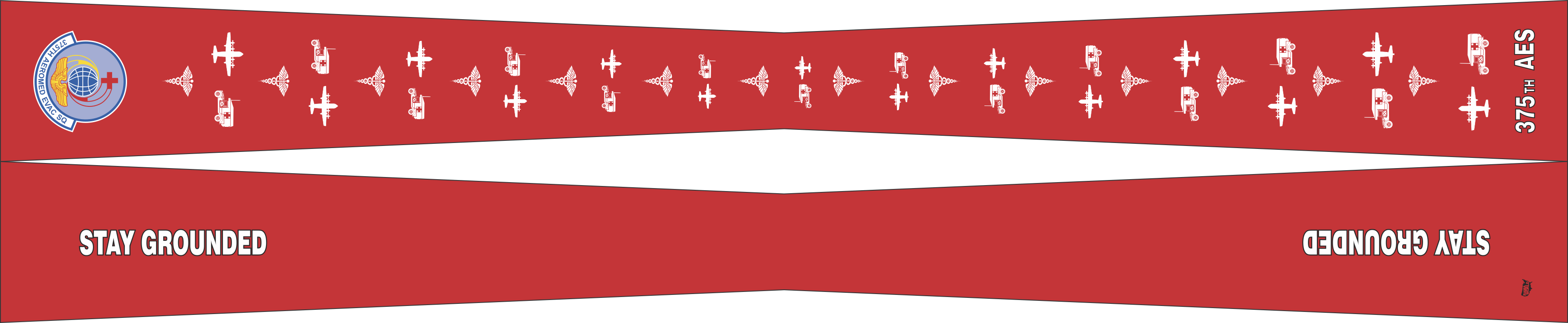Scott AFB 375 AES Flight Scarf. Red Background With Aircraft, Caduceus Logo & Humvee Pattern Along the Body of the Scarf, SQ Patch & Text on the Ends. "Stay Grounded" Text on the Opposite Side of the Scarf. Size: 4" x 2" x 4" x 48".