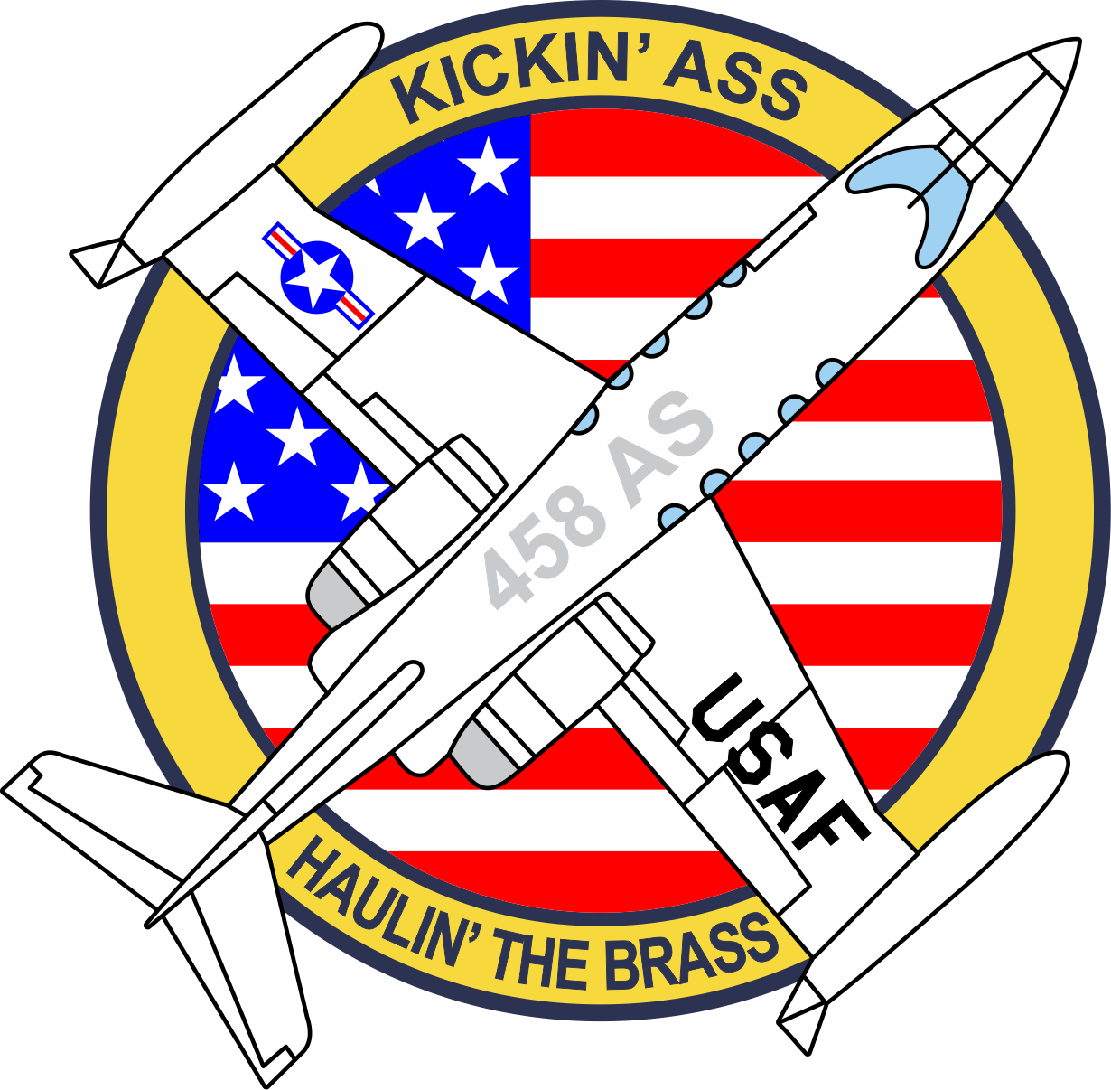 Scott AFB 458 AS Kinckin' Ass Haulin' The Brass USAF, American Flag Behind C-21 Aircraft Patch 4.8"