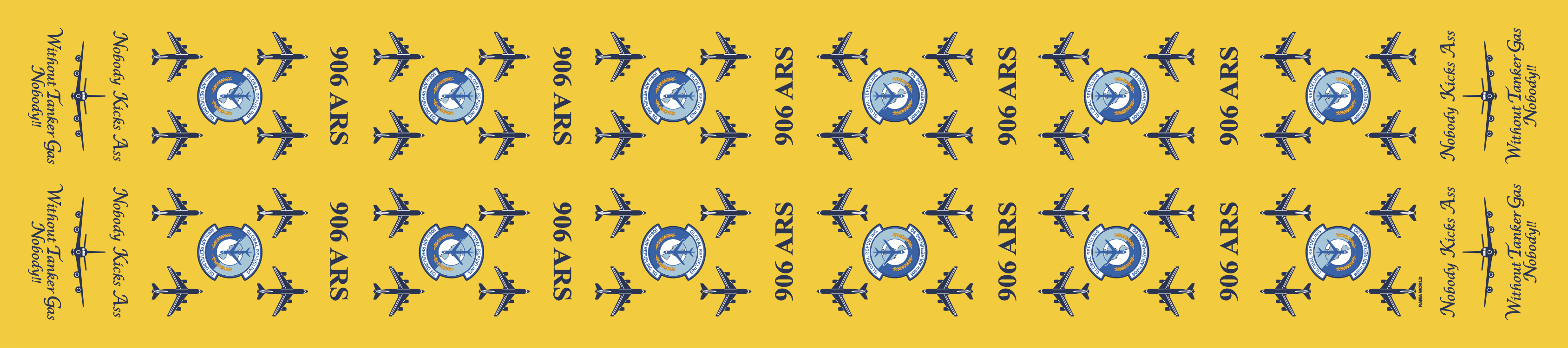 Scott AFB 906 ARS Flight Scarf. Yellow Background With KC-135 Aircrafts, SQ Patch, & "906 ARS" Text Throughout Scarf Design. Size: 4.5" x 44".