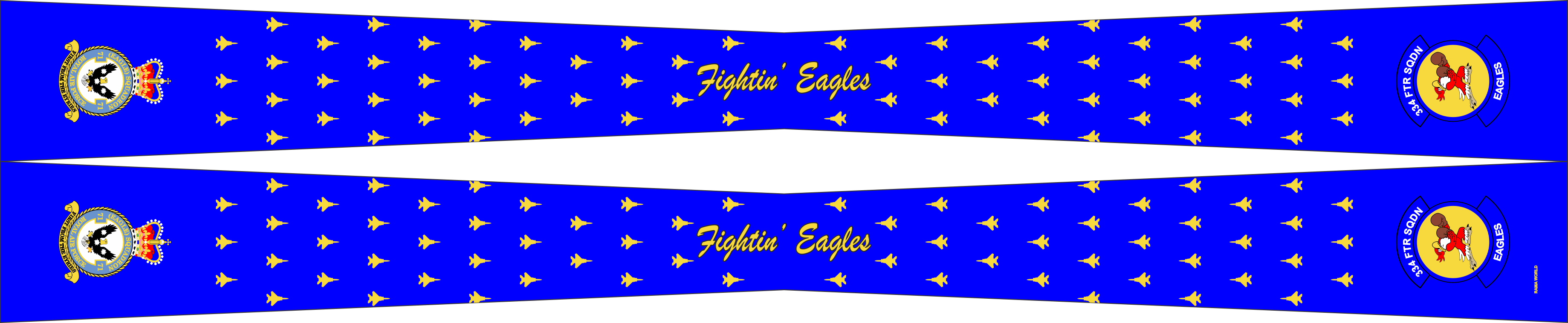 Seymour Johnson AFB 334 FS Flight Scarf with AF Blue Background, Patches on the ends, F-15E Aircraft Pattern along the Flight Scarf & "Fightin' Eagles" Text in the Center. Size: 4" x 2" x 4" x 48".
