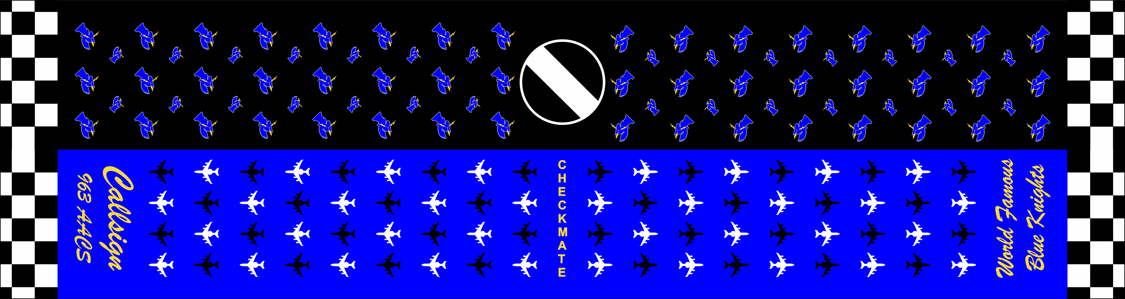 Tinker AFB 963 AACS Flight Scarf - AF Blue on one side with Black and White E-3 Awacs Aircraft's, "Checkmate" in the the center "Callsign 963 AACS" "World Famous Blue Knight" on the ends. The Other Half is Black with Pegasus Statue's with Lighting Bolts like the 963 AACS patch.