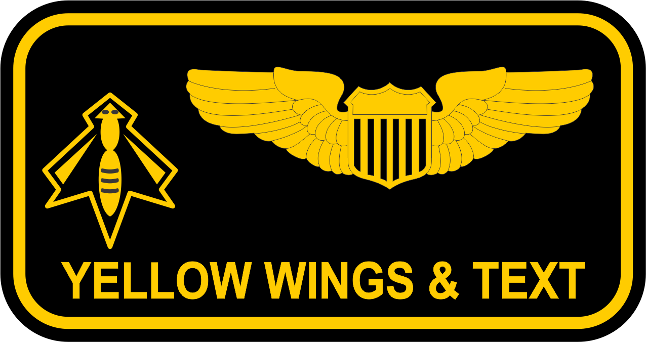 Travis AFB 21 AS Friday Name Tag: Black background, Yellow border, wings, text, and leather backing. Includes a yellow colored hornet on the left side.