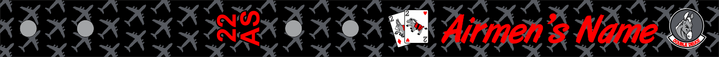 Travis AFB 22 AS - Black Background with Gray C-5's Throughout with Squadron Cards Logo with Donkey, Patch on the end, Red Text. Our standard size measures 13.5" x 1.5" when snapped.