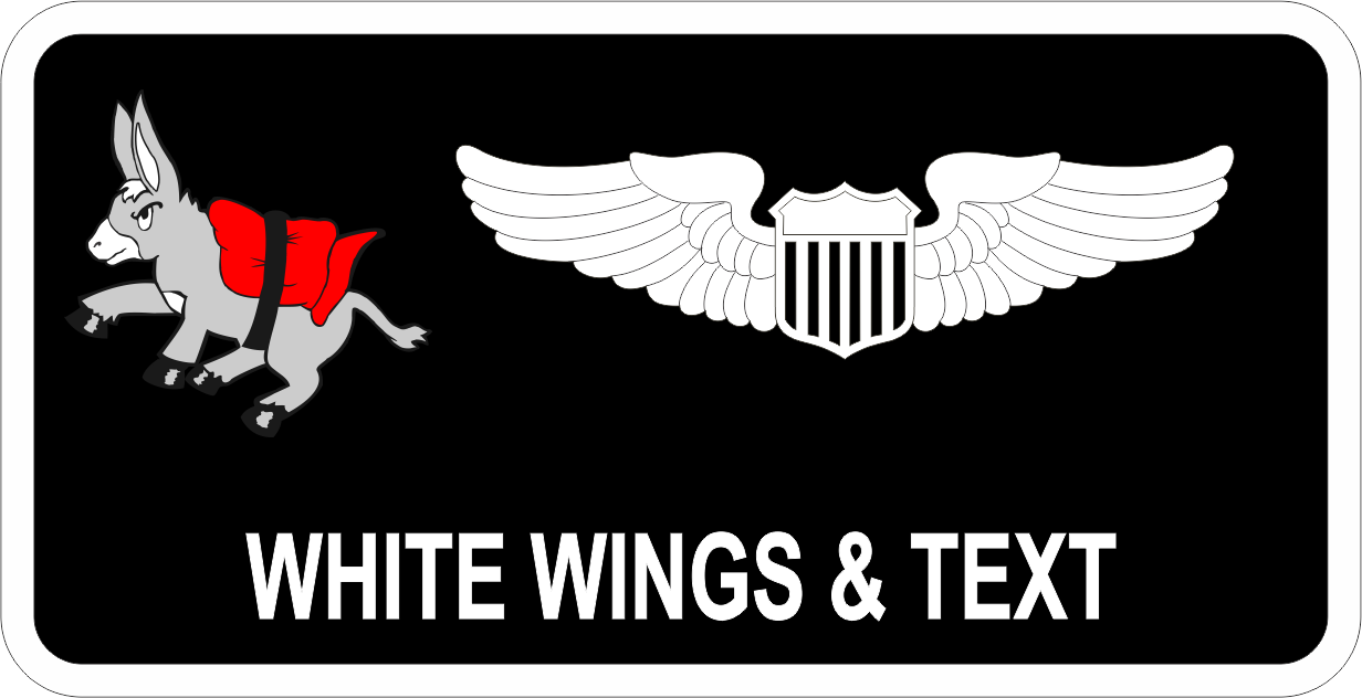Travis AFB 22 AS Friday- Donkey Name Tag - Black Background, White Border, Optional Leather Backing, White Wings & Text with Donkey Logo