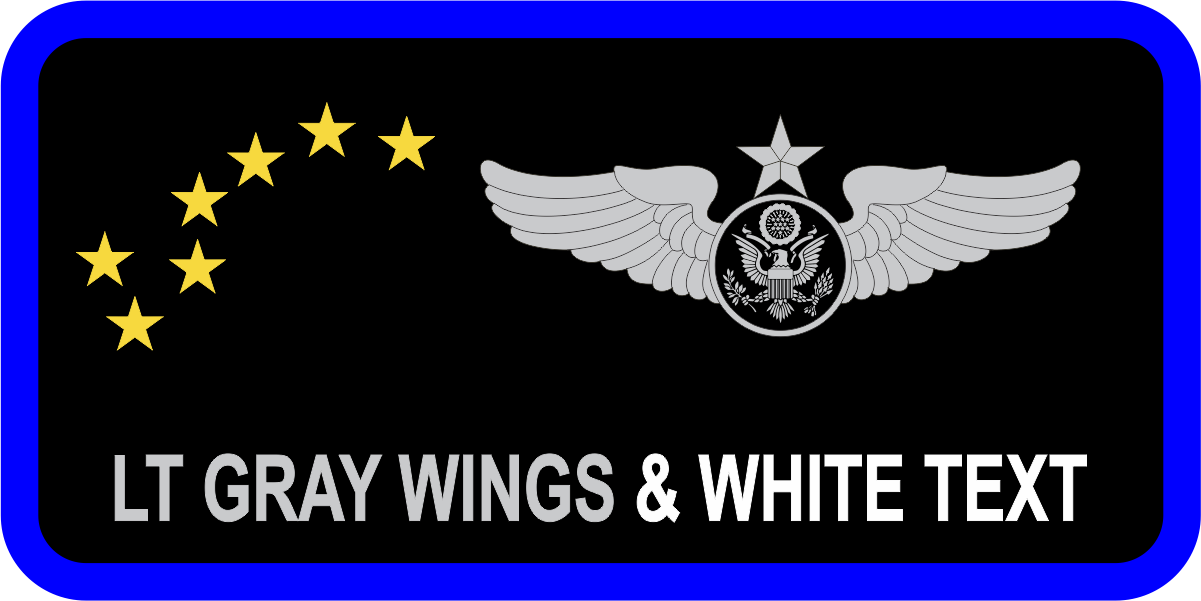 Travis AFB 349 OSS Name Tag - Black Background, Blue Border, Yellow Dipper Stars, Gray Wings & White Text. OPTIONAL Leather Backing! Select Leather Under "Backing" If Needed!