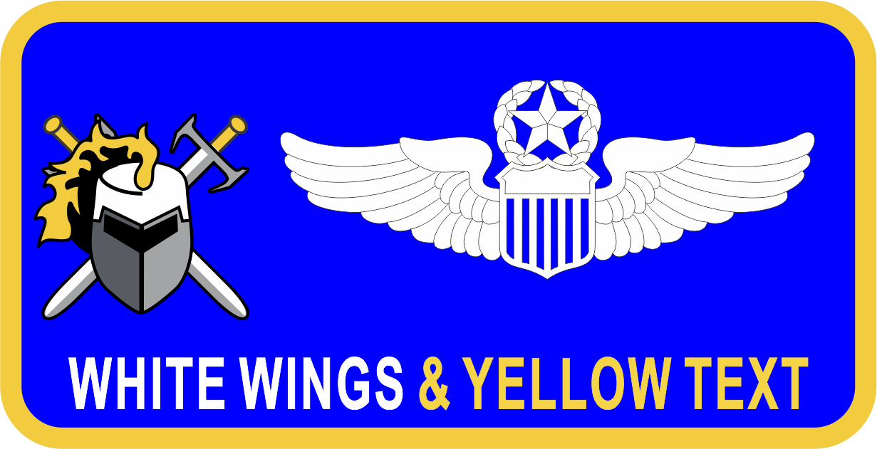 Travis AFB 60th Operations Support Squadron Name Tag - AF Blue background, Yellow Border, White Wings and Yellow Text with Knight with Swords Logo