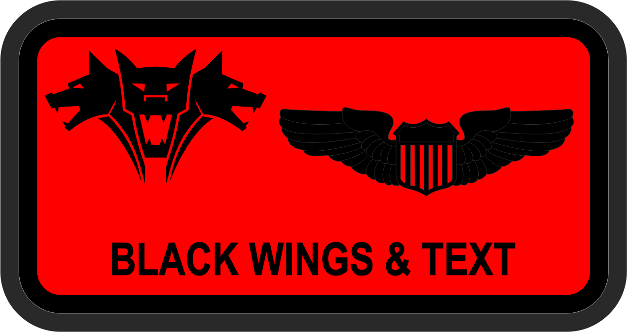 Travis 821 CRS Name Tag - Red background, black border with black wings and text with a three-headed dog.