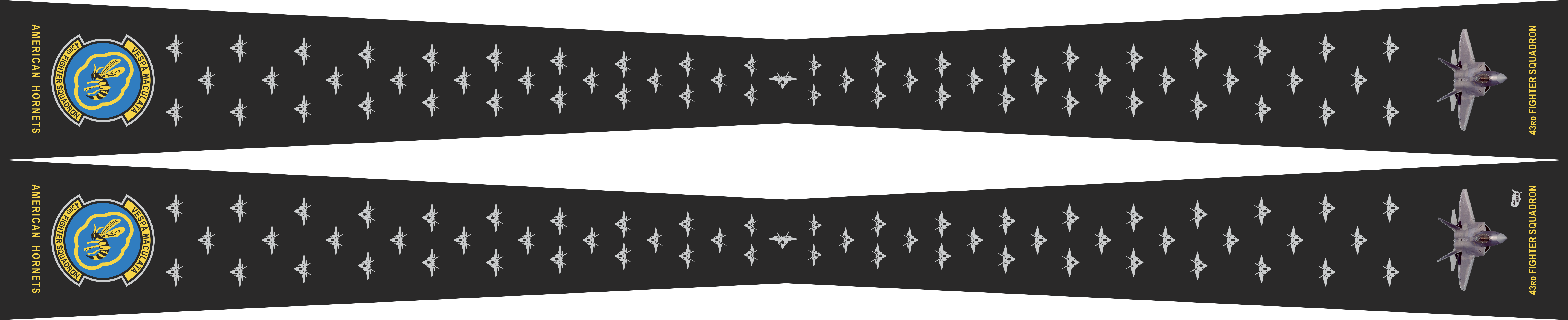 Tyndall AFB 43 FS Flight Scarf - Black Background, Gray F-22's Throughout, American Hornets, 43d Fighter Squadron Text, Patch on Ends - Tapered 4" x 2" 48"