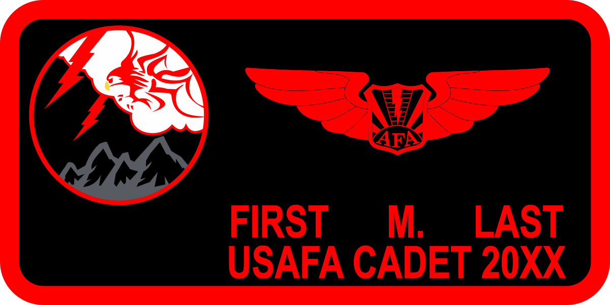 USAF Academy CS-12 Reconnaissance Name Tag - Black Background, Red Border, Red Wings & Text, Red, White, Gray & Black Logo
