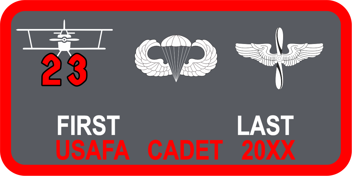 USAF Academy CS-23 Aircraft with 23 Name Tag - Gray Background, Red Border, White Wings & Text, Second Line Red Text - White Aircraft Red 23 Logo
