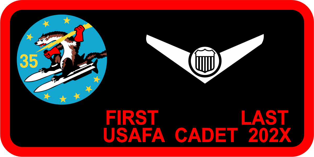 USAF Academy CS-35 - Wild Weasels Name Tag Red Border -- Black Background, Red Border, White Wings & Red Text, 35 Beaver Logo