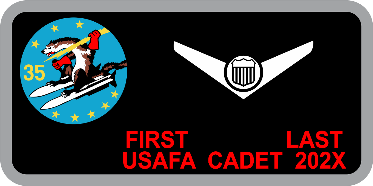 USAF Academy CS-35 - Wild Weasels Name Tag Gray Border -- Black Background, Gray Border, White Wings & Red Text, 35 Beaver Logo