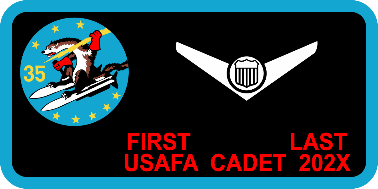 USAF Academy CS-35 - Wild Weasels Name Tag Blue Border -- Black Background, Blue Border, White Wings & Red Text, 35 Beaver Logo