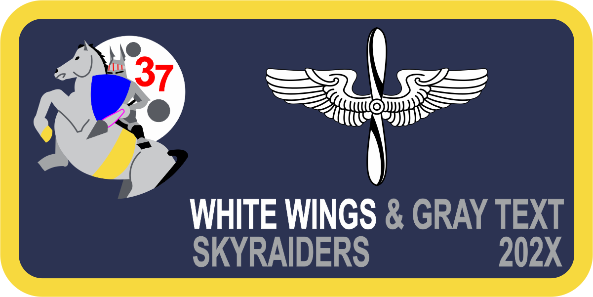 USAF Academy CS-37 Animalistic Skyraiders Name Tag - Navy Background, Yellow Border, Animalistic Skyraiders Logo. White Wings & Gray Text, Two Lines of Text