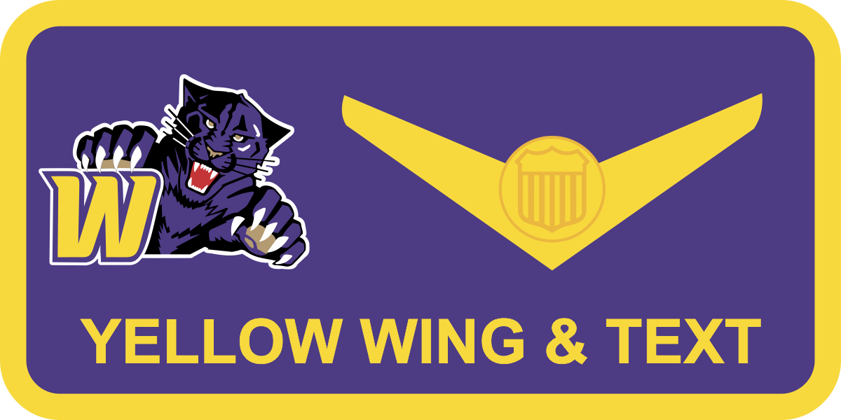 Wenatchee High School AFJROTC WA-20221 Panther Logo Name Tag - Purple Background, Yellow Border, Yellow Wings & Text, Panther W Logo
