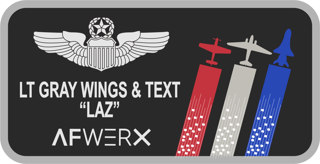 Pentagon AFWERX Name Tag - Black background, light gray border, light gray wings, and text, with red, gray, and blue aircrafts
