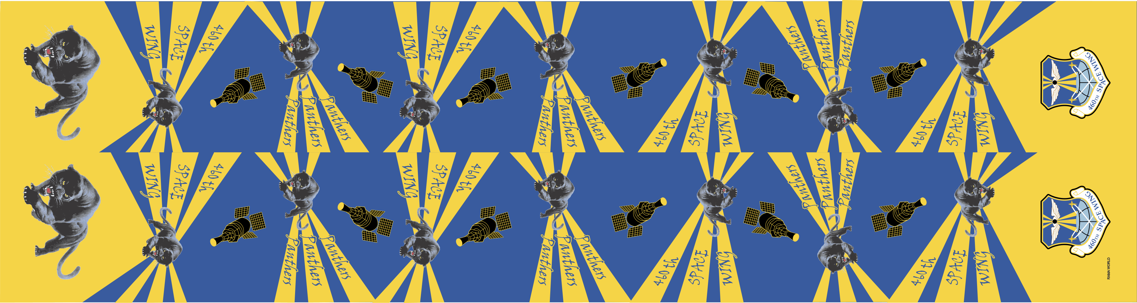 Buckley AFB 460 SW Flight Scarf - Blue and yellow body for both sides, 460th space wing text with an image of a black panther and Defense support program alternationg over the body of the scarf, on one end is a larger set of black panther's and the other end has 460 Space wing patches. Size 6" x 48"