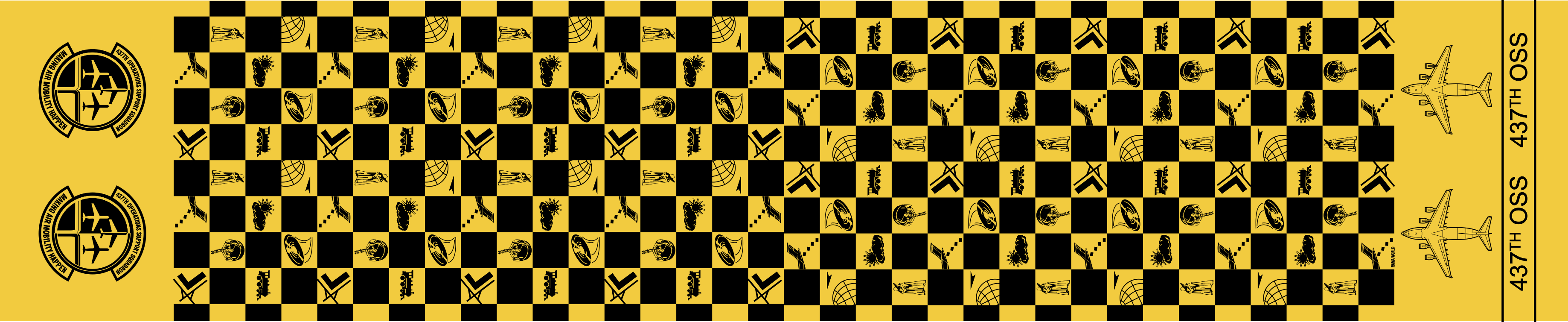 Charleston AFB 437 OSS Flight Scarf - Black and yellow checkered pattern body with small images over the body of the scarf and with C-17 at one end and 437 OSS patches on the other end. Size 4.5" x 48"