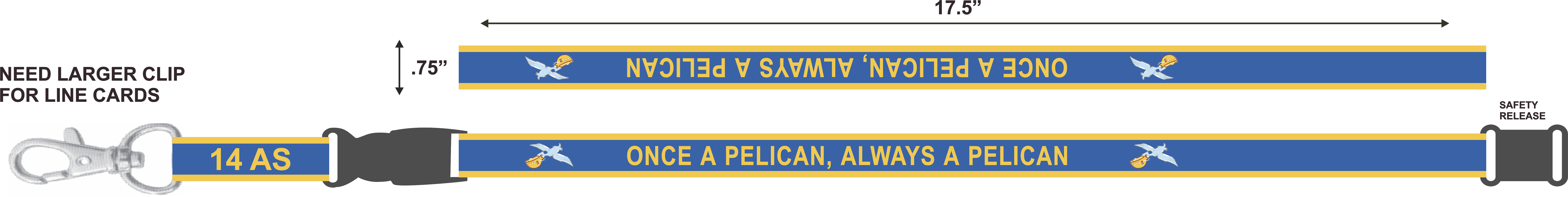 Charleston AFB 14 AS Lanyard - Blue to Yellow Border, Once A Pelican, Always A Pelican, Safety Quick Release, Larger Buckle