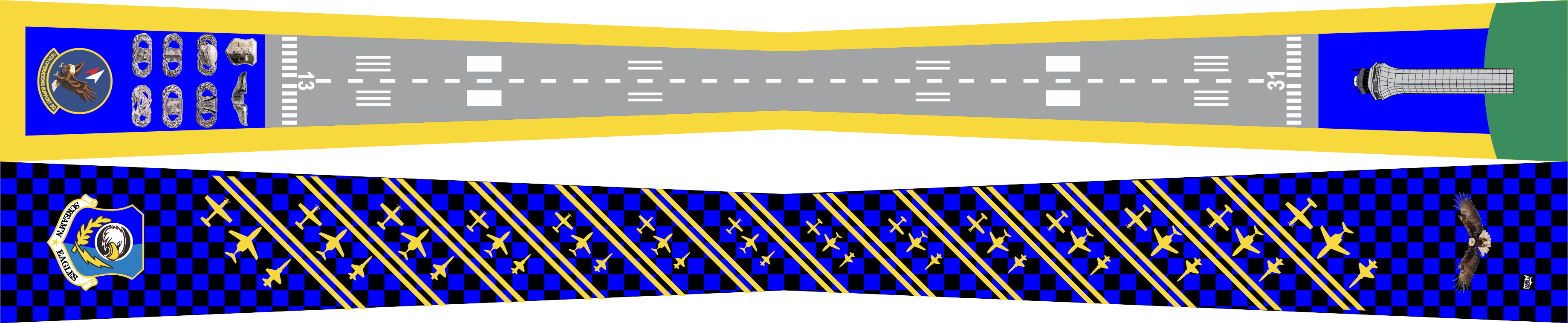 Columbus AFB 14 OSS Scarf. Front Side: AF Blue with AF Yellow Border, Runway going through the Center, Control Tower on one end and 14 OSS Patch with Badges on the other end. Backside: AF Blue & Black Checkerboard Pattern, Aircraft Candy Cane Pattern running along the Scarf, "Scream'n Eagles" Patch on one end & an Eagle on the other end. Size :4"x2"x4"x48"