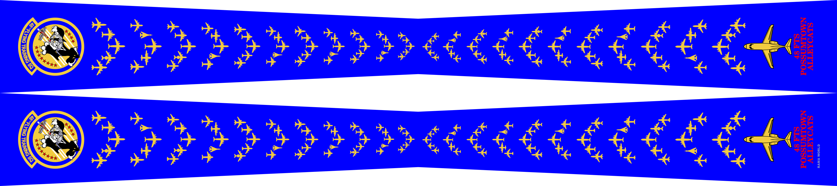 Columbus 48 FTS Flight Scarf - Blue body with yellow E-3 Awacs, B-1B, C-130, KC-10, and KC-135R aircraft's over the whole scarf with 48 FTS patch at one end, a T1A and 48 FTS Possumtown alley cats on the other end. Size 4" x 2" x 42"
