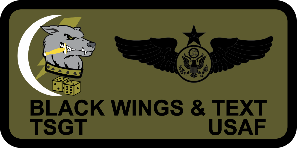 Duke Field AFB 859 SOS- Name Tag Subdued Green Background with Black Border, Black Wings and Text with a Grey Hound with blade in his mouth