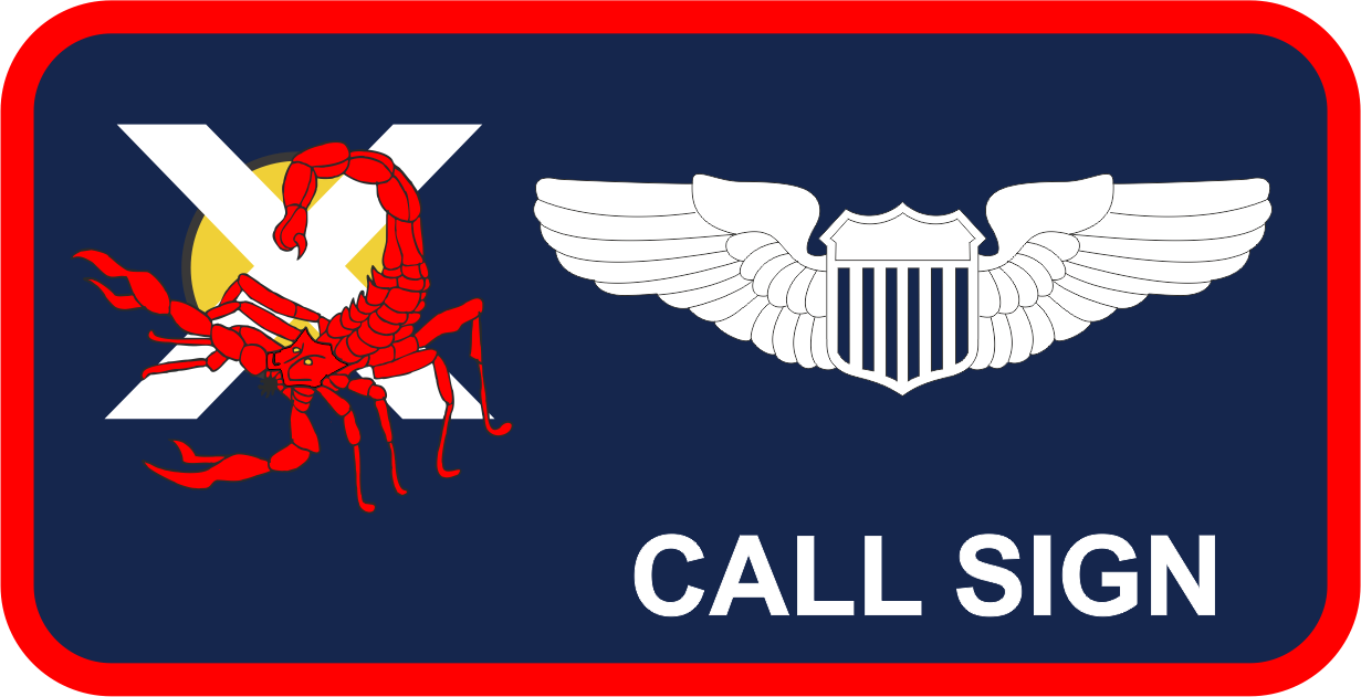 Edwards AFB 419 FLTS Friday Name Tag- Navy background with red border, white wings and text, red scorpion logo