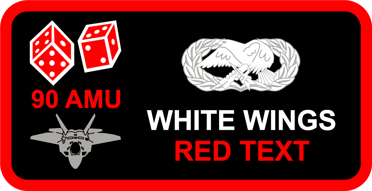 Elmendorf AFB 90 AMU Regular Name Tag- Black background, red border, white wings, red text - 2 lines if text - with gray F-22 aircraft.