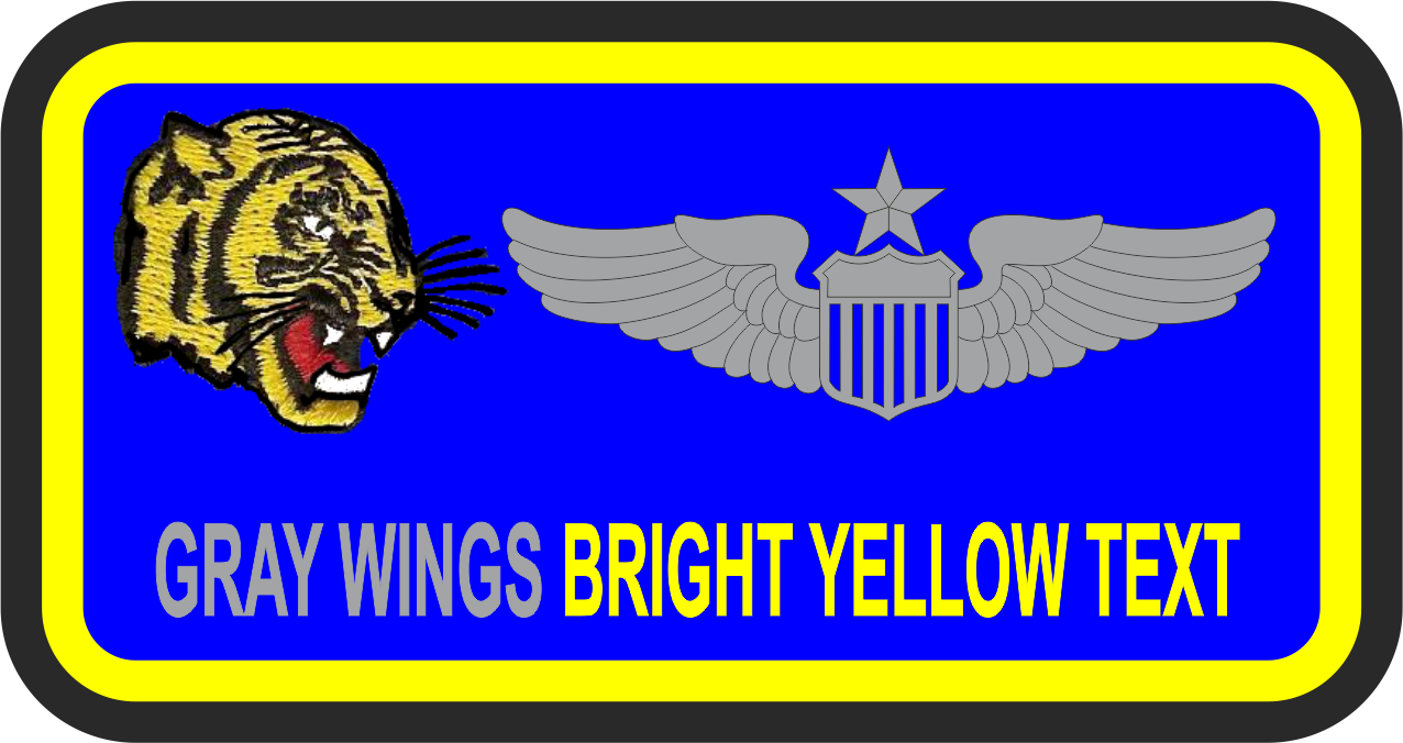 Laughlin AFB 85 FTS Name Tag - AF Blue Background, Bright Yellow Border, Gray Wings and Bright Yellow Text with Tiger Head Logo with Leather Backing