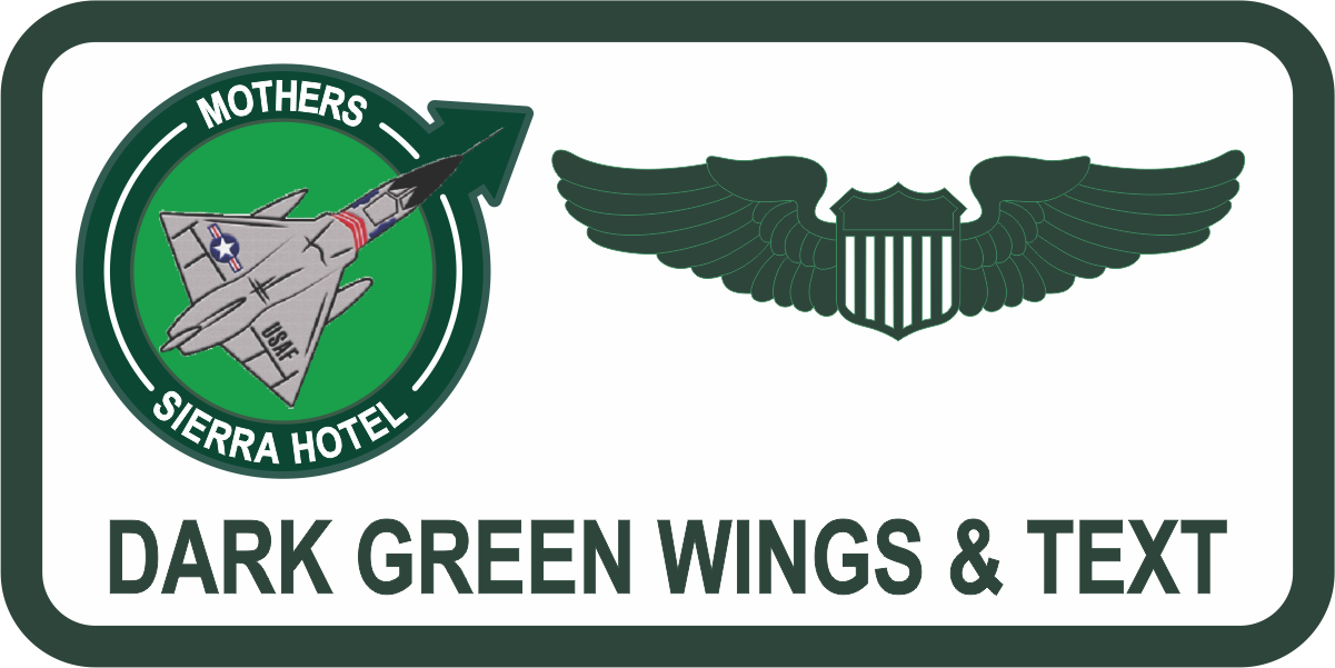 Laughlin AFB 87 FTS Mothers Sierra Hotel Name Tag - White Background Dark Green Border, Mothers Logo, Dark Green Wings & Text