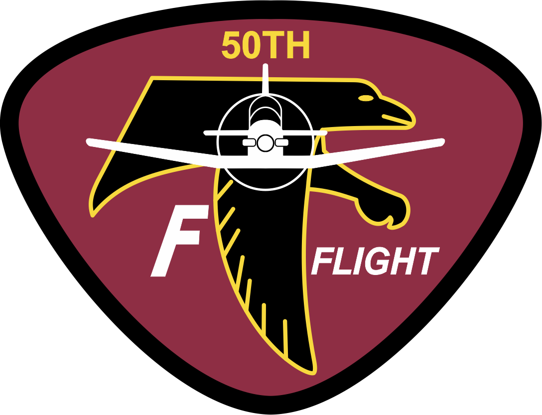Laughlin AFB E Flight - 85th FTS 50 Year Anniversary, F Flight, Maroon Background, Black/Yellow Stylized Bird, White/Black Aircraft 3.5"