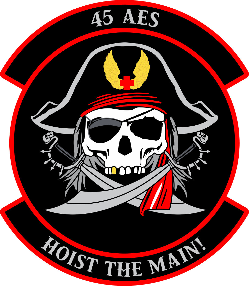 MacDill AFB 45 AES Hoist The Main! Black Background, Red Border, Skull with Swords, Full Color Patch 3.75" Revised 2025