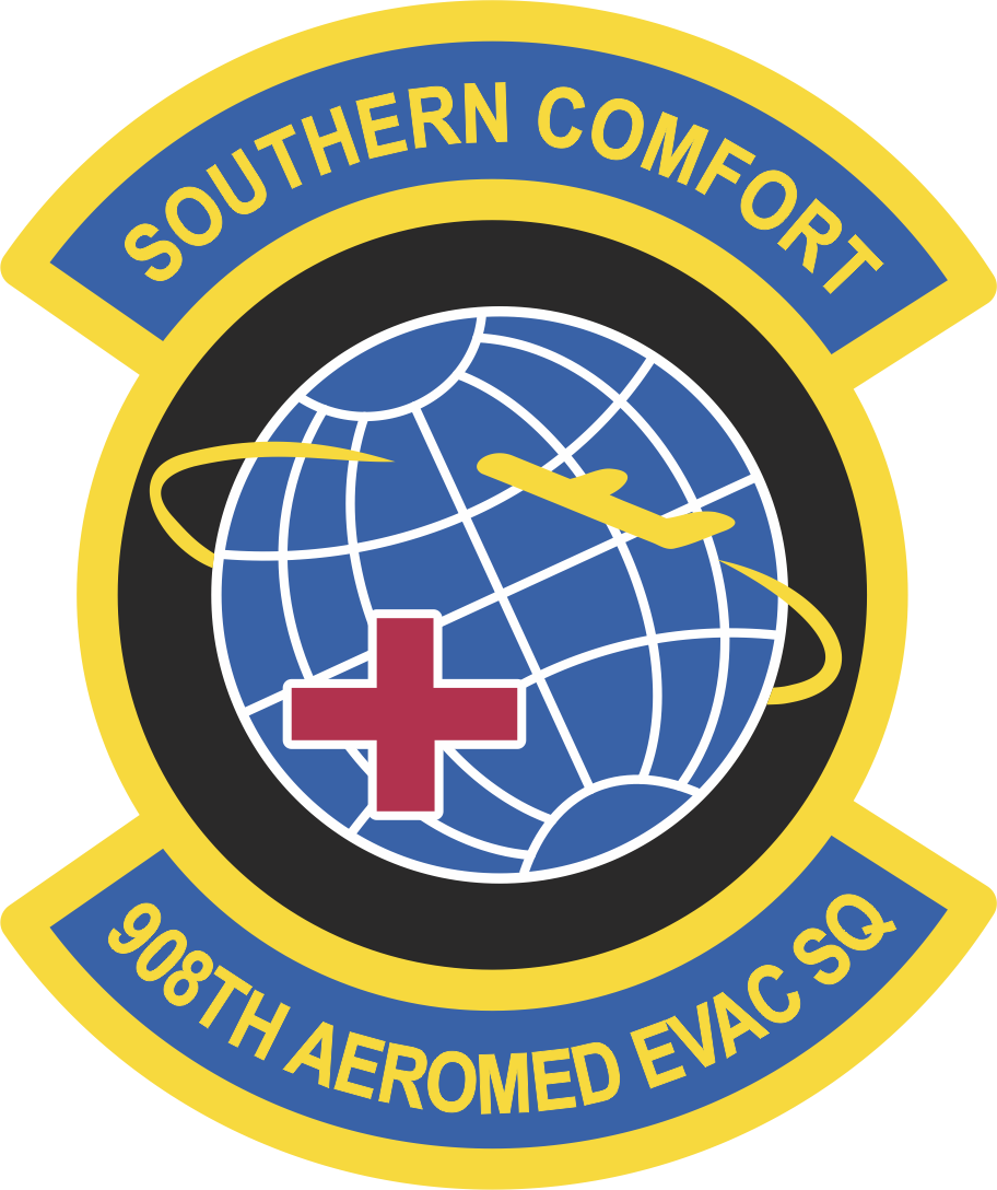 Maxwell AFB 908th Aeromed Evac Sq - Blue Globe, White Delineation Lines, Red Cross, Yellow Aircraft & Text, Yellow Border, PVC Patch - 3.5"