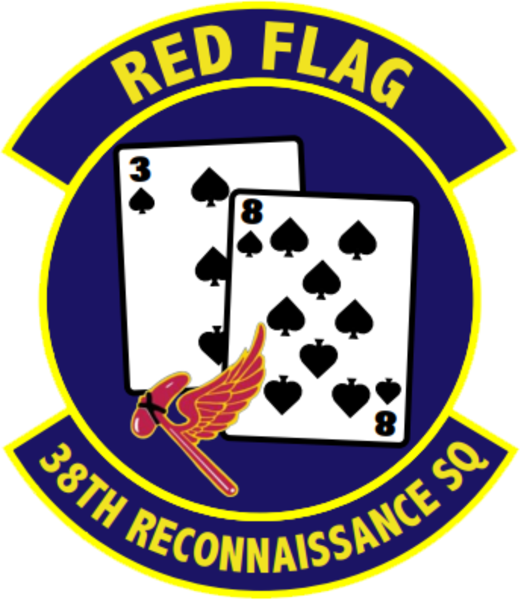 Offutt AFB 38th Reconnaissance Sq Red Flag Number 38 Cards with Red Winged Tomahawk, Navy Background, Yellow Border, 4" Patch