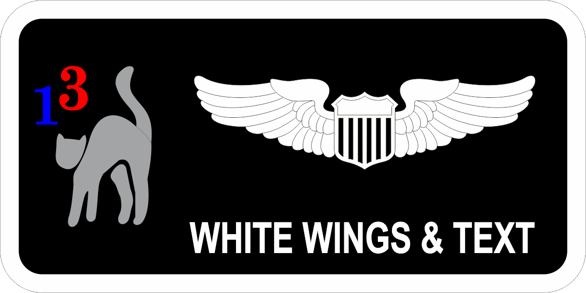Seymour Johnson AFB 4 TS 13 Gray Cat Name Tag - Black Background with White Border, Wings & Text, with Blue & Red 13, Gray Cat Logo